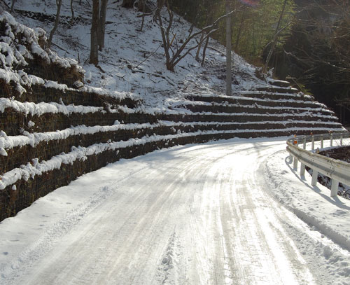 雪でスリップを起こしてフェンスを突き破り、崖に転落しました。